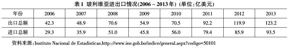 从出口看,莫拉莱斯执政期间,由于中国等新兴市场经济体经济快速增长,国际市场对能源、矿产和大宗农产品等初级产品的需求持续增加,价格也不断走高。作为初级产品出口国,玻利维亚从国际市场的强劲需求和不断改善的贸易比价中获益较多,天然气、矿产品和农牧产品出口数量和数额都大幅增加。2014年,玻利维亚进出口总额达到128.56亿美元,同比增长5%,其中油气、矿产品和大豆出口分别占玻利维亚出口总额的51.7%、30.4%和8.5%。(20)得益于有利的贸易环境,2006~2014年年底,玻利维亚已连续8年保持贸易顺差(见表1)。尽管近年来出口总额占GDP的比重基本保持在30%左右,但由于进口增长同样迅速,净出口对经济增长的直接拉动作用并不明显,更多是通过出口收入大幅增加带动消费和投资,从而对经济增长发挥间接作用。
