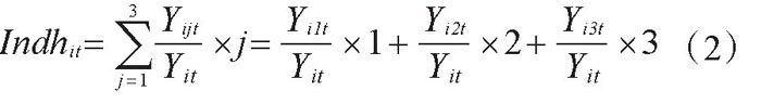 被解释变量ISit代表产业结构高级化和产业结构合理化。其中,产业结构高级化反映的是根据经济发展的历史和逻辑序列从低水平状态向高水平状态顺次演进的过程,主要是用三大产业产值占生产总值比例的演进过程Indhit衡量。(4)计算公式如下: