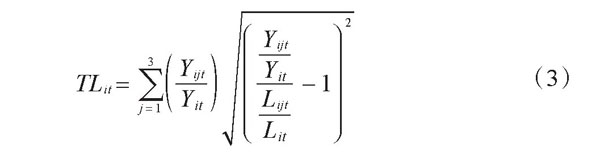 其中,Yit代表生产总值,j代表第j产业部门。Yijt/Yit代表第j产业部门产值占比。产业结构的高级化与Indhit成正比,第三产业部门占比越大,产业结构越高级。但是产业结构的高级化并不意味着产业结构的合理化,尤其是拉美国家普遍存在“去工业化”且服务业异质性过大的问题,第三产业占比很大但产业结构并不合理。因此,同时使用产业结构合理化来衡量资源在产业间的配置和利用的效率,引入产业结构偏离度TLit。(1)计算公式如下: