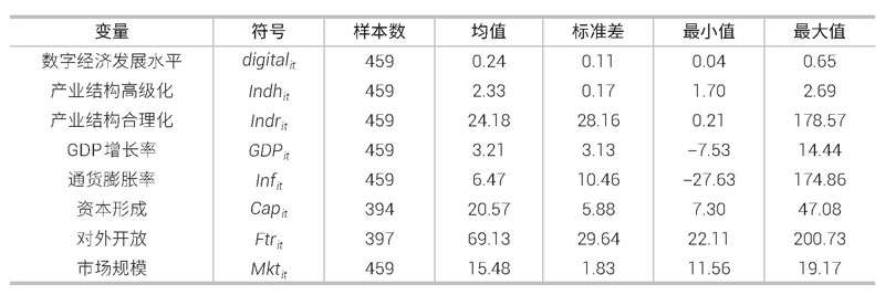 本文选取的控制变量Xit包括:一是经济增长,用GDP增长率表示。经济增长通常通过需求升级、技术进步和资本深化推动产业结构升级。二是资本形成,用固定资产形成占GDP之比表示。在产业结构演变过程中,固定资产投资具有推动、促进作用。三是市场规模,用总人口表示。总人口可以作为评估市场规模的基础指标之一,因为它是市场规模的潜在上限,也是需求规模的基础。四是宏观经济的稳定性,用通货膨胀率表示。通货膨胀率高往往反映经济政策的不稳定和市场预期的不确定,进而影响企业的投资决策和长期发展战略。五是对外开放水平,用贸易总额占GDP之比表示。开放水平高的经济体更容易吸引外资,促进知识和技术的传播,从而影响产业结构。