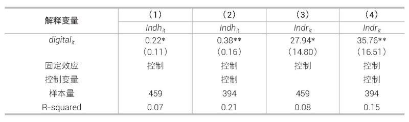 其中,劳动生产率LPijt为产业增加值和就业人数的比值,(1)回归结果参见表4第(6)列,表明数字经济对产业结构高级化仍有显著的正向影响。