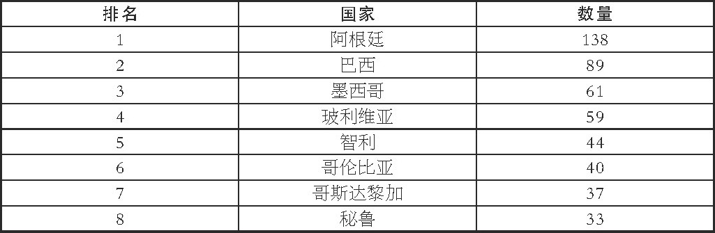 据《2016年全球智库指数报告》的统计显示, 截止2015年底, 拉丁美洲共有智库835个 (中南美洲共有774个, 墨西哥有61个, 在《报告》中被计入北美洲) , 占全球智库总数的12.2%, 在全球七大地区排名居中, 处于第四位。我们可以看到, 拉丁美洲智库的集中度较高, 在拉美地区政治、经济、社会、文化具有较大影响力的国家, 同时也占据了该地区智库排名的前列。拉美地区智库最多的前十个国家拥有599个, 占该地区智库总量的72%。2015年, 拉丁美洲地区智库数量排名靠前的国家依次是:阿根廷 (138个) 、巴西 (89个) 、墨西哥 (61个) 、玻利维亚 (59个) 、智利 (44个) 、哥伦比亚 (40个) 、哥斯达黎加 (37个) 、秘鲁 (33个) 、多米尼加共和国 (31个) 、巴拉圭 (27个) 、乌拉圭 (21个) 、委内瑞拉 (20个) 、古巴 (19个) 。