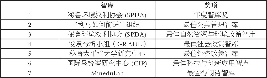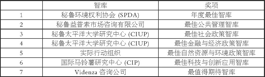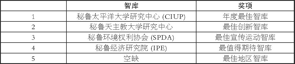 受英国杂志《Prospect》的启发, 从2013年开始, 英国智库On Think Tanks与秘鲁国内的《Poder》杂志强强联手, 开始评选“Poder年度智库大奖” (PODER Think Tank of the Year Awadrs) , 旨在表彰秘鲁国内为社会作出突出贡献的智库和政策研究机构, 力求和传播秘鲁智库最具原创性、影响力和严谨性的研究成果。我们可以从奖项名称上一窥秘鲁智库类型的全貌, 社会政策智库、公共管理政策智库、金融与经济政策智库、自然资源与环境政策智库、科技与创新应用智库、地区智库等构成了秘鲁智库“民办为主, 小而俱全”的基本格局。近年来, 秘鲁智库在国家政治的舞台上扮演了一个不可或缺的角色, 不仅为国家的发展献言献策, 还成为了公共决策的重要环节。