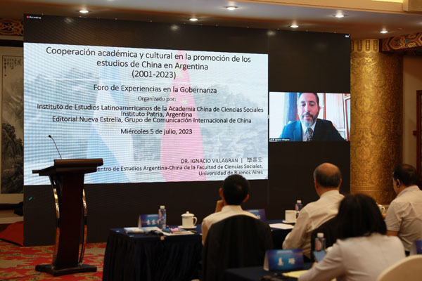 专题研讨共分两个部分,专题一聚焦“治国理政经验交流”,由林华副主任主持。中国社会科学院金融研究所党委书记兼副所长龚云指出,中国共产党领导的中国式现代化彰显出持续性、本土性、人民性、借鉴性和先进性的经验特征,创造了全面建成小康社会的奇迹。布宜诺斯艾利斯大学中国研究中心主任伊格纳西奥·比亚格兰充分肯定了中阿两国近年来在学术交流方面取得的长足进展,期待双方书籍出版、学者对话继续加强沟通合作。中国社会科学院国际法研究所副所长柳华文从法律基础和国际经验角度,充分肯定了中国人权事业以全人类共同价值为方向的进步性。秘鲁天主教大学教授帕特里西亚·卡斯特罗·奥本多透过中秘共建的一个秘鲁港口案例,从技术发展、产品增值、跨国合作等方面分析了中拉合作的未来前景。